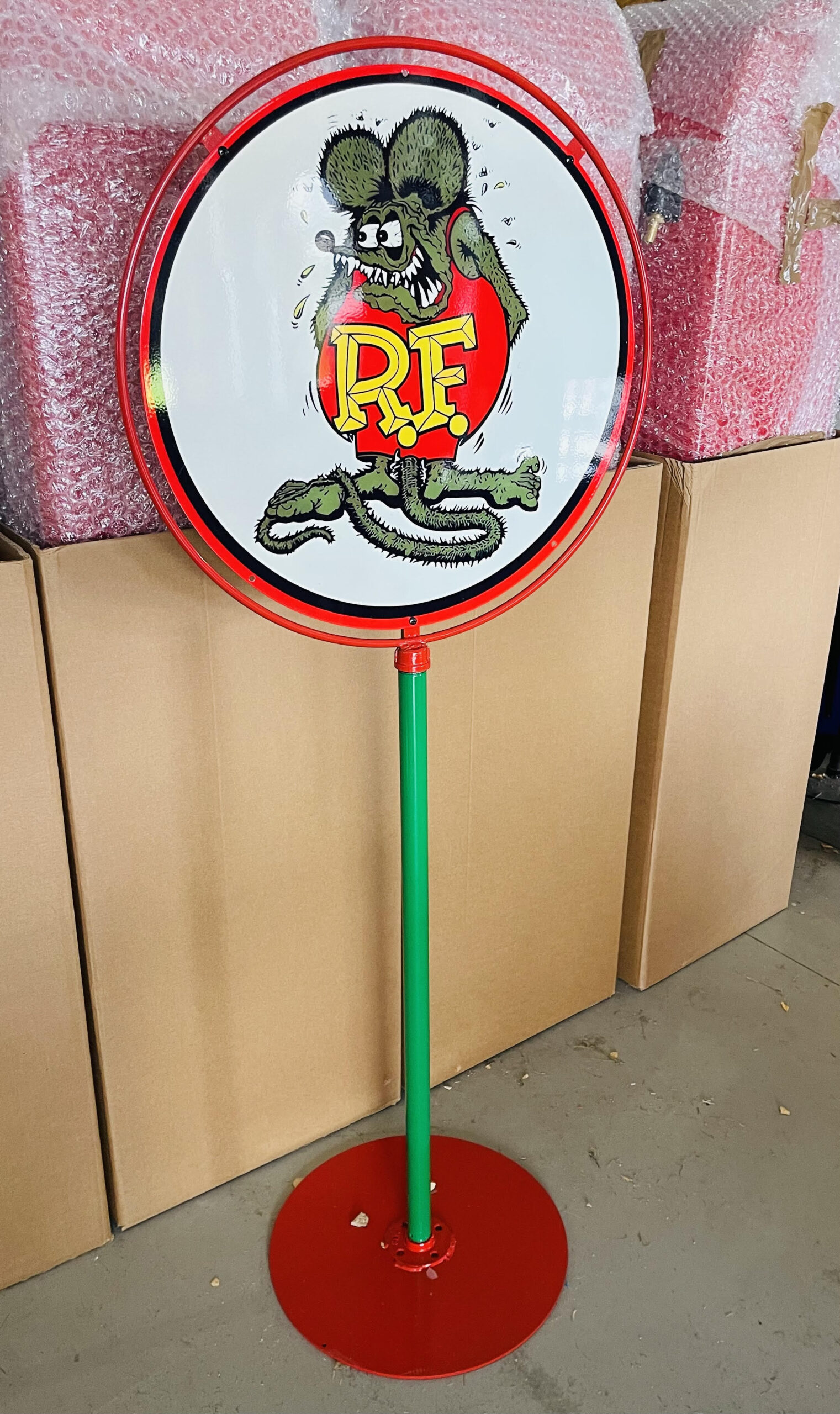 RatFink Lollypop stand. This is a replica 1950’s tin metal sign seen in early service stations. The overall height is 153cm and can be used indoor or outdoor.